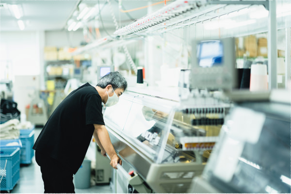 最良のニットを編むために、編み機専属の技術者が在籍しています。長年培ってきた経験と目、指先、耳、様々な感覚を研ぎ澄ませ0.05mm以下の調整を行ないます。